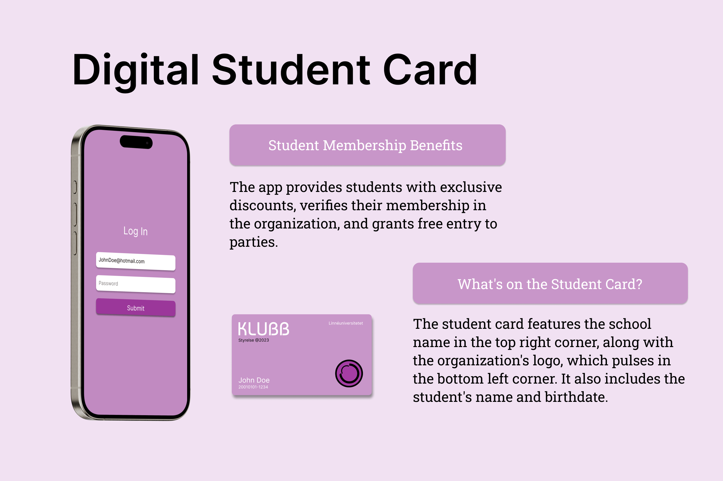 Physical cards can be difficult to manage and keep organized. This can be simplified by introducing digital cards. As mass-producing unique cards for every student can be very costly. A student organization called Klubb at Linnaeus University in Växjö, Sweden, contacted me for a solution to provide student IDs for their members, granting them access to discounts and other benefits.